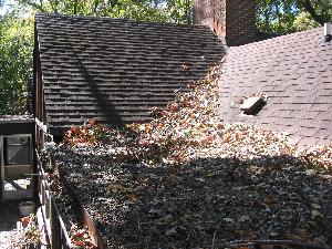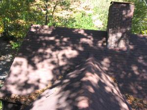 MISCELLANEOUS INFORMATION, (REFER TO REPORT PICTURES) SHINGLE AND FLAT GRAVEL AGGREGATE ROOF COVERINGS: 1,2,3,4,5,6,7,8,9,10,11,12-The main house shingle roof covering and flashing around the penetrations appear adequate with no loose or missing areas. The date stamps on the rubber boot flashing around the white vent pipes that pierce the roof are worn and unreadable, however the shingle roof is estimated to be from 10 to 12 years old. The left side sections of shingles are darker discolored from normal aging because they face north and receive less sunlight. The items listed below were observed during the inspection. -Large piled sections of leaves and twigs were observed along the backside roof valleys and flat grave aggregate roof areas. Leaves hold or retain moisture causing premature aging. -The open exposed sections of tar on the flat gravel aggregate sections over the rear enclosed deck, skylight room, and master bedroom porch has some spider web type cracking from aging. Further investigation by a licensed roofing contractor of all flat gravel aggregate roof covering after removal of all leaves and twigs is recommended. |