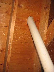 INTERIOR MISCELLANEOUS INFORMATION It does not appear that the two bathroom exhaust fans vent properly to the exterior which is always recommended. Fans completely covered or buried under insulation can cause the surrounding plasterboard to become deteriorated and also add heat to an already hot summer attic. Inexpensive kits purchased at major home centers contain flex hose that can be installed from the fan to a soffit or gable vent. |